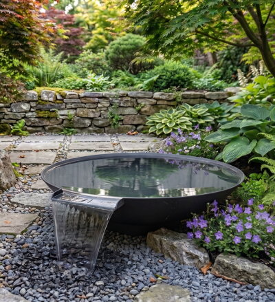 Ušľachtilý fontánový set, ktorého dominatou je misa z kvalitnej lakovanej ocele s ručne spracovaním žľabom v šírke 15cm. Súčasťou setu je štadardne pevný rezervoár na vodu spolu s krytom, ktorý je vhodný na trvalé zapustenie do zeme a zároveň slúži ako úkryt celej technológie fontány. Nádoba má tiež inštalovaný vypúšťací ventil tak, aby bolo možné kedykoľvek vodu z nádrže vypustiť, či už z dôvodu údržby alebo dočasného zazimovania fontány. K vodným setom s misou je možné si zvoliť teplé biele LED osvetlenie, ktoré celú magickú atmosférú v záhrade ešte viac umocní. Sety mís z lakovanej ocele a žľabom sú dostupné v rôznych veľkostných variantoch.